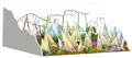 Un fondale di vette disegnate su pannelli a specchio circonda teatralmente il giardino; alcune “piramidi di ghiaccio” (strutture a specchio di forma diamantina) introducono nello scenario la luce intensa e chiara tipica dei paesaggi in quota, mentre un sistema di nebulizzazione alimentato con pannelli solari simula un accenno di bruma mattutina.